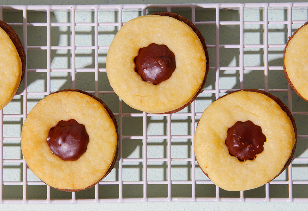 5. Kavla ut den naturella degen och ta ut rundlar om ca 6 cm i diameter. Ta ut ett hål i mitten med kakmått, kork eller tyll. Lägg på bakplåtspappersklädda plåtar.