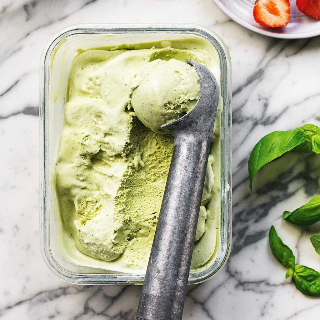 Vad tänker du när du hör basilikaglass? Jag tänkte ingenting första gången jag smakade den. Jag trodde för det första att det var en kardemummaglass, möjligtvis med inslag av lakrits. Jag såg att den var grön, men kände ingen pistagesmak. Jag slogs också av att det var en av de godaste glassar jag någonsin ätit. Sedan dess har jag gjort den så många gånger, alltid på sommaren och tillsammans med färska jordgubbar. På grund av att jag gissade på kardemumma har jag börjat krydda upp den med det och det är en sådan fullträff.