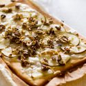 6. Bred ut moset på ett stort fat eller flera mindre. Forma en kant runt om och häll den röda paprikasåsen i mitten. Toppa med knapriga timjankvistar och oljan.