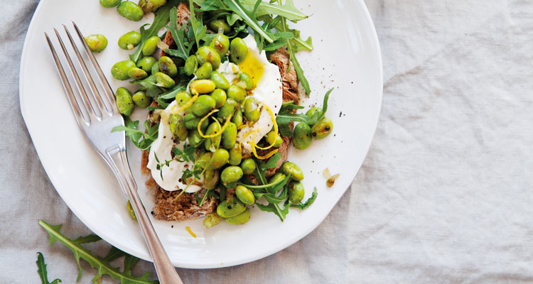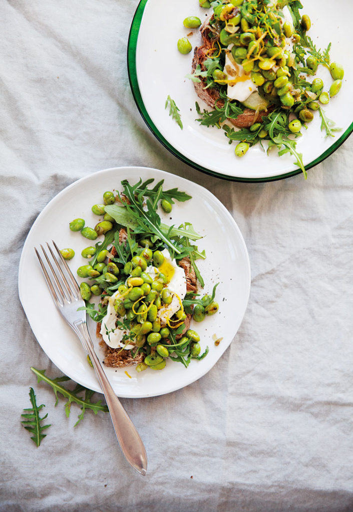 Lägg rucola på brödskivorna, bred majonnäs över och toppa med bönfräset. Riv eventuellt lite extra citronskal över.