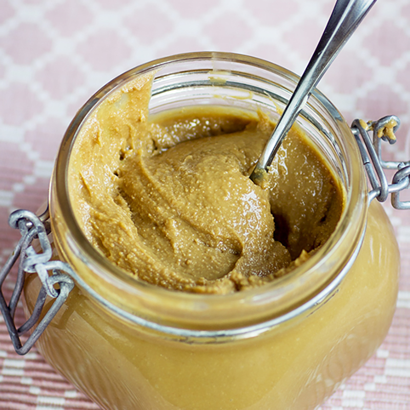 - Häll ner samtliga ingredienser till jordnötshummusen i en matberedare och mixa till en krämig hummus. Du kan även ta hjälp av en stavmixer.