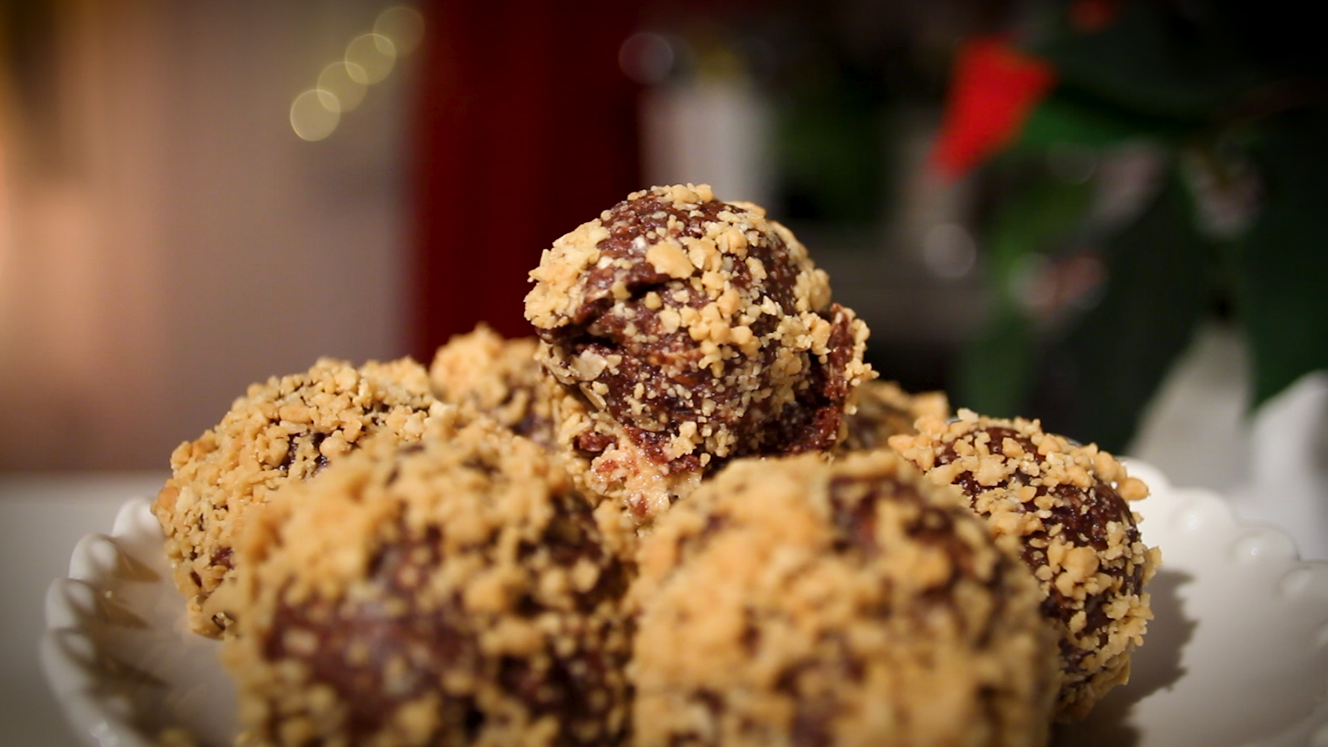 Rulla en boll. Gör en fördjupning i bollen och tryck in en bit fryst jordnötssmör. Rulla ihop. Rulla sedan bollen i de mixade jordnötterna. Du kan behöva fukta bollarna med lite vatten för att nötterna ska fastna.