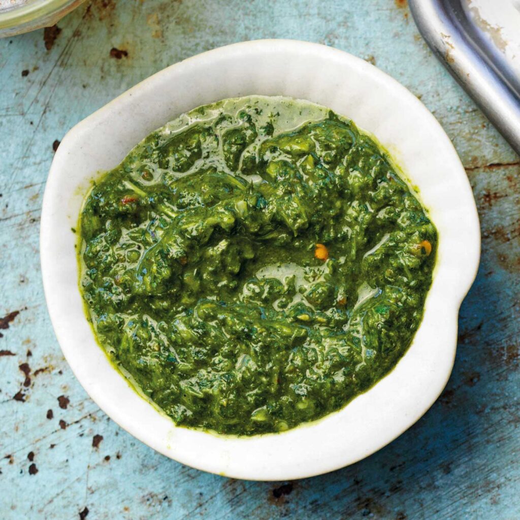 - Häll ner samtliga ingredienser i en matberedare och mixa ihop till en tjock, härligt grön sås. Den ska inte bli för fint mixad i konsistensen.