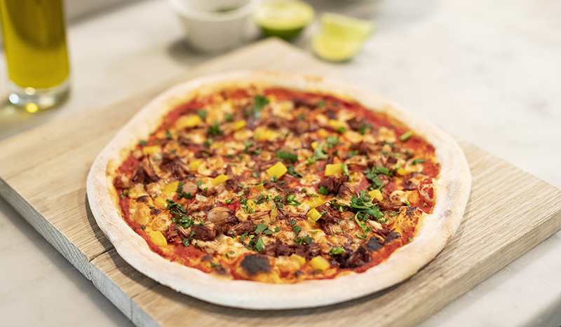 Tävlingspizzan hade Vapianos klassiska deg som bas, förgylld med bl.a. äppelmarinerad jackfruit, chili, koriander och mango.