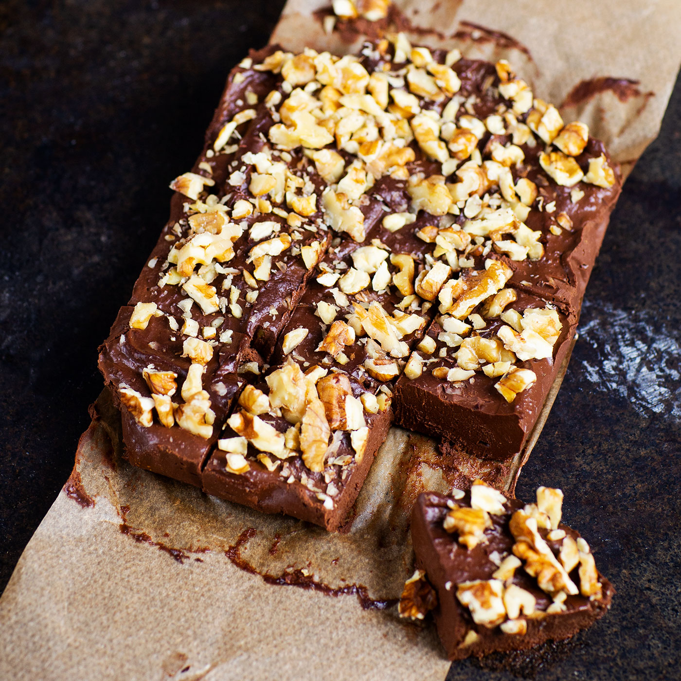3. Lägg på nästa botten och bred sedan ut resten av chokladfrostingen runt hela tårtan. Servera som den är eller toppa med färska bär.