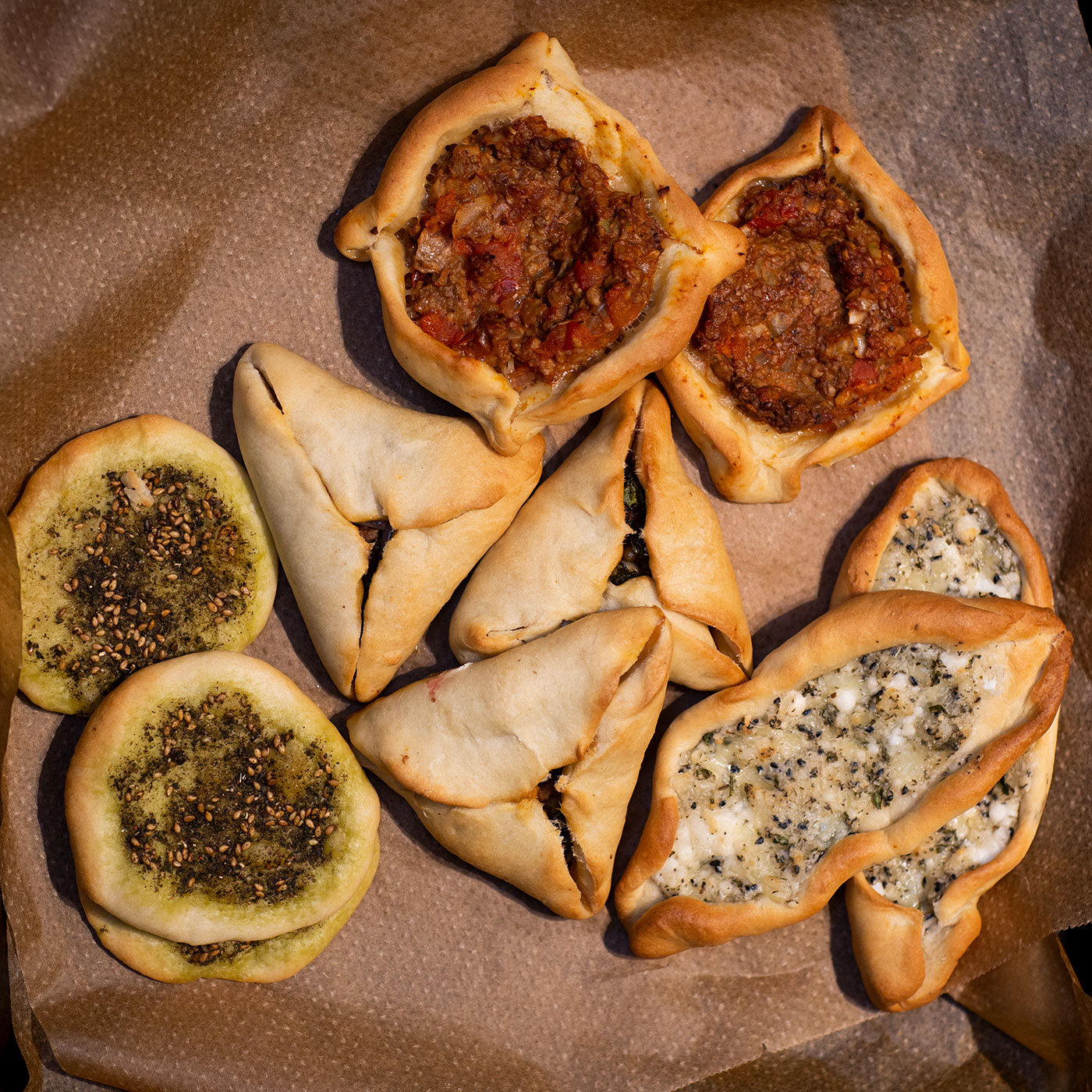Jag vill börja med att säga att det här är inte mitt recept, det är från min favoritkanal på youtube just nu, Middle Eats. Jag har bara förenklat vissa grejer och ändrat om måtten till deciliter. Det här är alltså fatayer, små pajer som är vanliga runt om i Mellanöstern. De är små, som naggande goda snacks, och kan fyllas med allt möjligt. Här är fyra varianter: spenat, ost, färs och za’atar. Det var lite pill men sjukt kul att göra med vänner och familj. Speciellt eftersom det blir så himla gott.