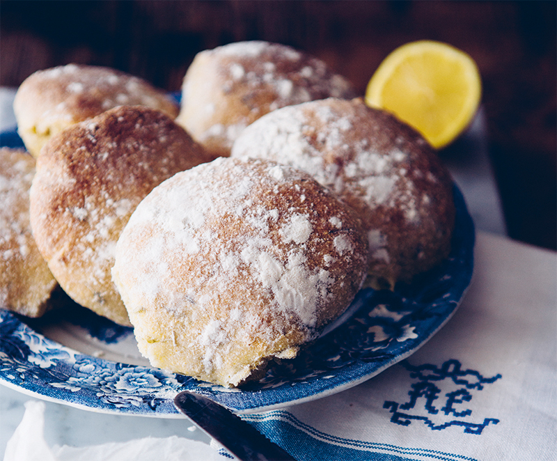 4. Stjälp ut degen på ett lätt mjölat underlag, och dela den i 10 bitar som väger cirka 80 g styck. Rulla bitarna till runda bullar. Lägg dem på en plåt klädd med bakplåtspapper. Mjöla dem lätt med vetemjöl.