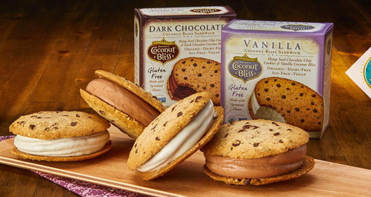 Även Coconut Bliss vill frälsa oss med smältande god glass. Här omringad av glutenfria chocolate chip cookies med hampafrön.