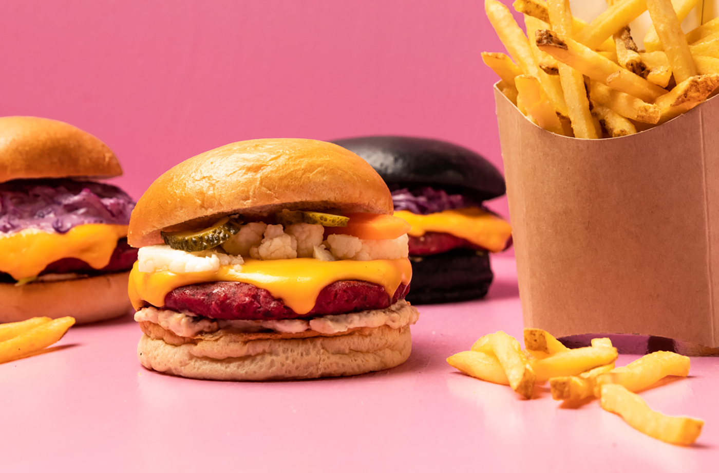 Green Butcher serverar till att börja med två olika burgare gjorda på den egenframtagna rödbetsfärsen. De kommer med rostad majskräm, vegansk ost och hemmagjord pickles respektive vegansk majonnäs, ost samt rödkålssallad. På menyn finns även sallad med rödbetsfalafel, krispigt grönt samt kräm på mungböna och gräslöksdressing. Varje dag finns även en indisk soppa baserad på röda linser som serveras med ett helveganskt vitlöksbröd.
