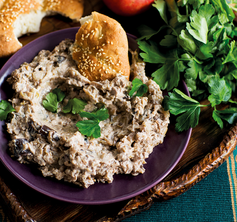 5. Mixa valnötterna till ett fint mjöl i en matberedare. Vänd ner i auberginen tillsammans med yoghurten.