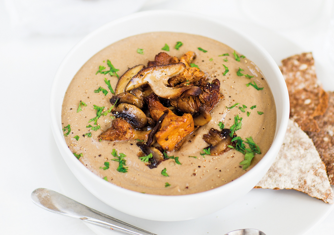 6. Häll upp soppan i skålar och toppa med stekt svamp.