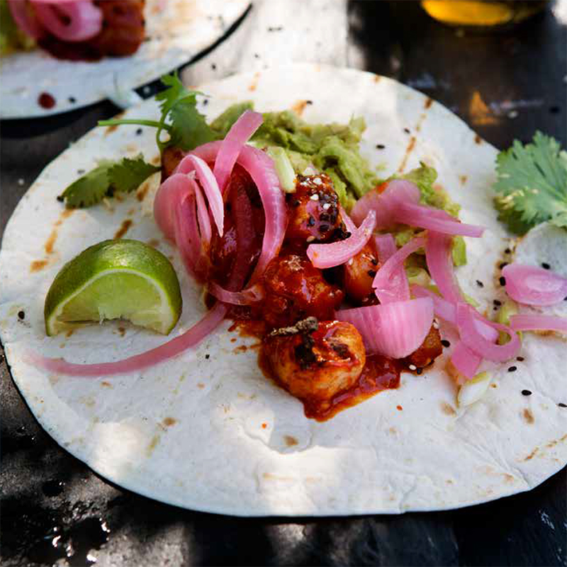 Värm tortillabröden. Strimla vårlökarna. Fyll tortillabröden med det grillade vegoköttet och toppa med strimlade vårlökar, guacamole, picklad rödlök och sesamfrön. Servera med limeklyftor.