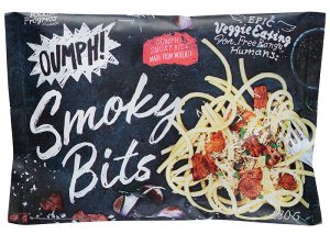 Oumph Smoky Bits är små rökiga bitar gjorda på vetegluten som blir läckert knapriga när du steker på de i en lite olja. Supergoda i en klassisk vegocarbonara, att strö över din caesarsallad, använda i grytor, på pizza, gratänger, på mackan mm. Jag gillar att steka de i ganska mycket olja och när de fått ordentligt med färg låta rinna av på lite hushållspapper så att de blir extra knapriga.