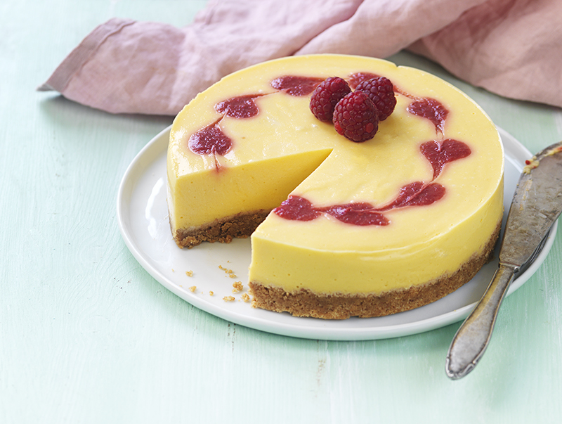 Krossa eller mixa digestivekex till smulor och tillsätt smör. Blanda ingredienserna noga och pressa ner bottnen i en springform.