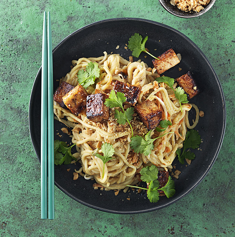 5. Blanda nudlarna med jordnötshummus, morot och böngroddar. Servera tillsammans med den tamaristekta tofun.