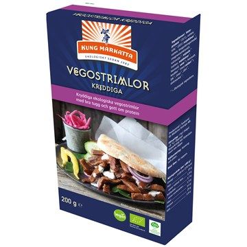 Ekolgiska vegostrimlor har en härlig kryddning och passar till det mesta . Superenkla att tillaga i stekpannan. Och fort går det! Räkna med fem minuter, sen är det klart. Du får ett mumsigt alternativ till kött, med som är rikt på protein från ekologisk tofu och vete. Servera gärna i pitabröd med tzatziki, lök, tomater och sallad.