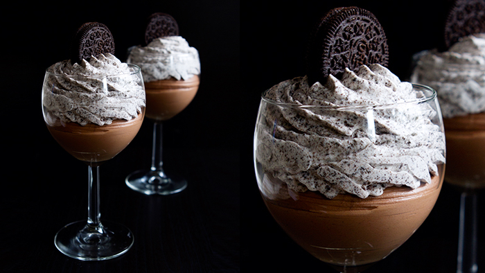 Spritsa eller skeda ner oreomoussen över chokladmoussen. Dekorera med fyra vanliga oreokakor eller flera mini-oreos.