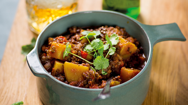 4. Smaka av med salt och peppar. Servera tillsammans med matvete, matkorn, quinoa eller fullkornsris.