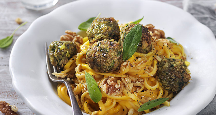 Blanda pastan med pumpasåsen. Servera tillsammans med nötbollar, hackade valnötter och färsk salvia.