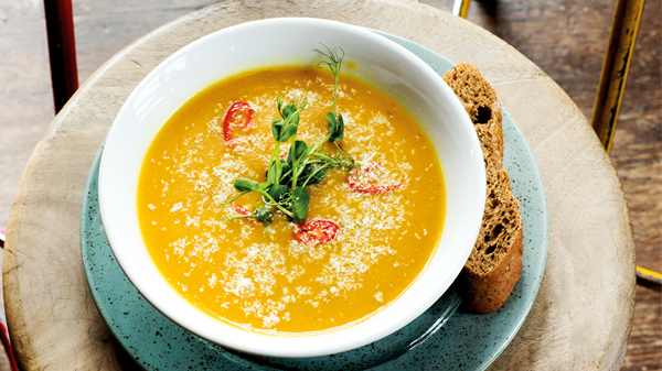 Det här är en värmande soppa med lätt hetta från vitlök, chili och ingefära. Strö över lite rostad kokos precis vid servering.