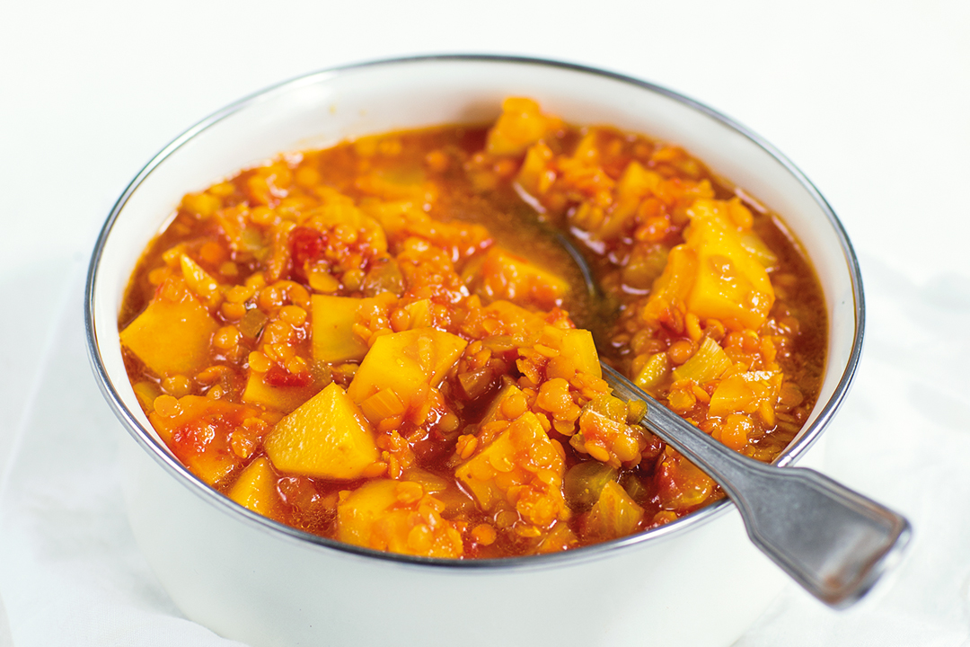 3. Rör ner resterande ingredienser och koka upp. Låt sjuda i 10 minuter. Linserna ska mjukna men inte koka sönder. Krydda med salt och peppar.