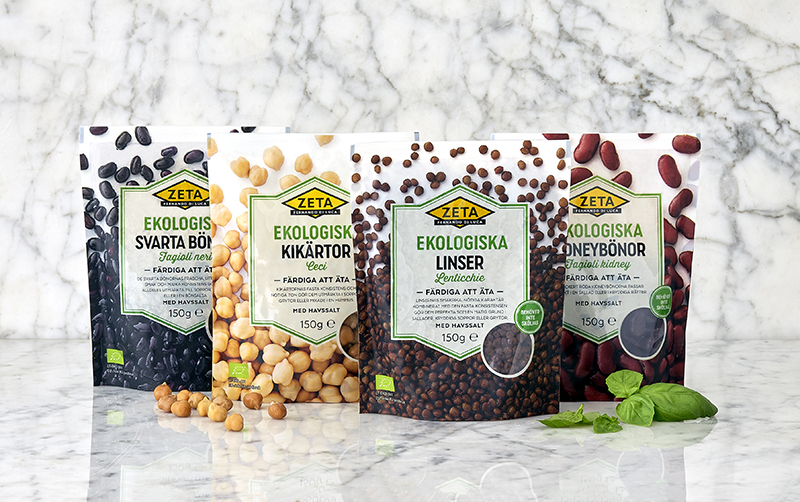 Zeta ekologiska bönor utan lag säljs i 150 g stora ståpåsar och finns i fyra varianter: kidney, kikärtor, svarta bönor och linser. Priset är cirka 20 kronor och de finns att köpa i välsorterade matbutiker.