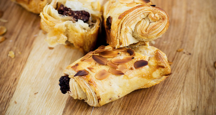 Mixa eller rör ihop mandelmassa och mörk choklad. Fördela krämen på ena änden av smördegsplattan och rulla ihop.