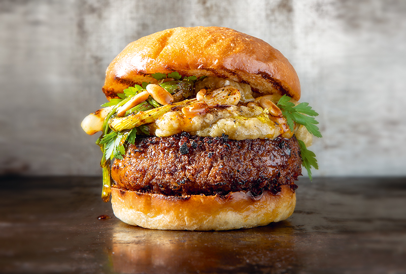 Martin Nordin bjöd på den här burgaren när han lagade mat på scen på Sthlm Food & Wine för två år sedan. Jag blev helt golvad av alla texturer och smaker. Han hade verkligen tänkt på allt. Ja, det är lätt att gå till formbar färs, men få saker slår en riktig maffig bönburgare. Vegansk dessutom! Här samsas en kryddig burgare med grillad salladslök, baba ganoush (som fastän det står kolrostad kan göras i ugnen, det gör jag) och sen det piffiga i att ha rostade pinjenötter och citronskal som du absolut inte får glömma. En grymt god vegetarisk burgare.