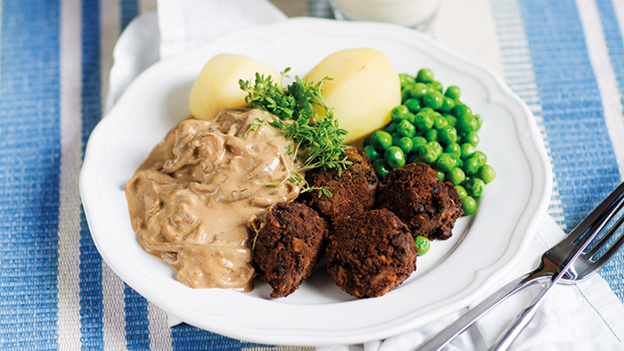 Servera bönbollarna tillsammans med löksås, kokt potatis och lingonsylt.