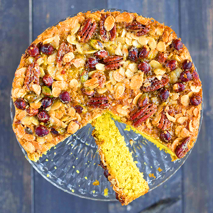 Toscakaka är alltid gott! Här kommer en med saffran i själva kakan och en blandning av härliga nötter på toppen. Dessutom äggfri!