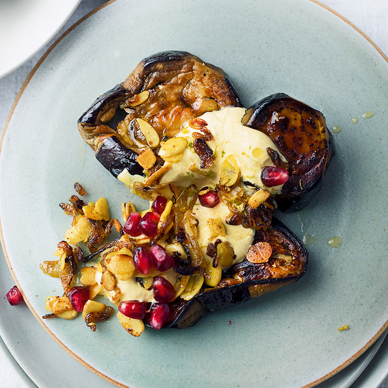 5. Lägg vid servering upp aubergineskivorna så att de överlappar varandra något på ett fat eller på separata tallrikar. Skeda över yoghurtsåsen och toppa med den stekta lökblandningen. Strö över spiskumminfrön, korianderfrön, granatäppelkärnor och limeskal och servera.