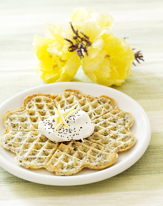 Gör smeten som ovan. Blanda ner vallmofrön och rivet citronskal och grädda tills de blir vackert gyllenbruna. Vispa grädden fast och fluffig. Söta med florsocker och vaniljsocker. Rör ner citronsaften. Servera våfflorna med citrongrädden och dekorera med vallmofrön.