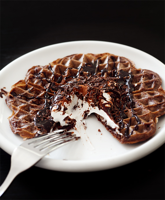 Gör smeten som till Klassiska våfflor men ersätt ½ dl vetemjöl med ½ dl kakao. Grädda tills de blir vackert gyllenbruna. Servera med vispad grädde, chokladsås och riven mörk choklad. Pudra avslutningsvis över lite kakao.