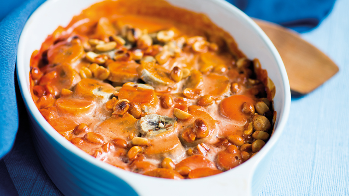 Skiva bananerna och fördela över kikärtorna tillsammans med jordnötterna.