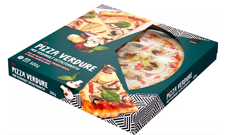 En helt vegansk kyld pizza, redo att grädda i ugnen och är klar på några minuter. Yeey!