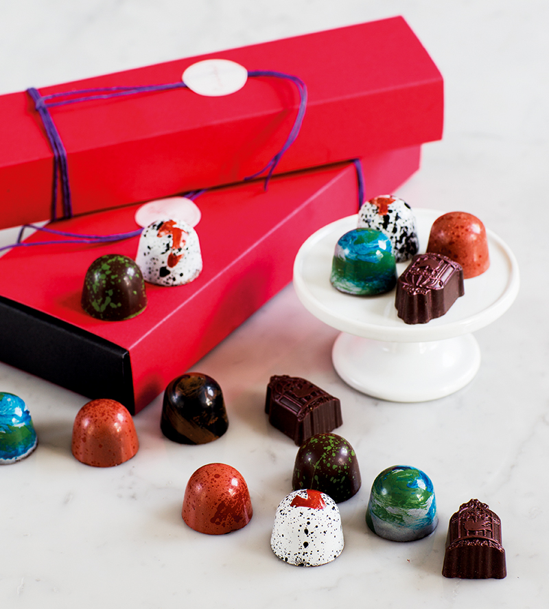 – När det gäller mat och desserter så handlar det mycket om mode. Man hämtar inspiration från varandra. Just nu är det mycket fokus på vackra handmålade praliner. Förr gjordes smakerna med arom, men jag ville använda riktiga frukter och bär. Vi försöker att använda riktiga frukter, bär och grönsaker så gott det går. Det är lite svårare att jobba med sådant eftersom smakerna inte är lika koncentrerade.