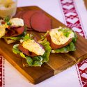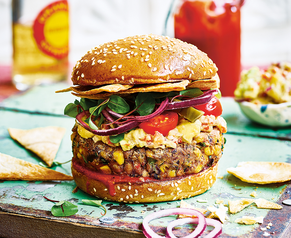 Bygg dina mexikanska burgare så fort de har kommit ut ur ugnen. Börja med ett lager guacamole. Lägg sedan på biffen, följt av en klick salsa och lite nachochips.