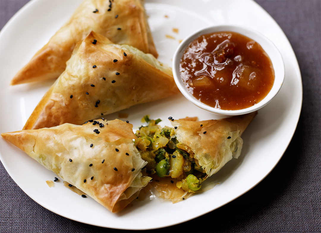7. Lägg dem på bakplåtar och sätt in dem i ugnen i 25 minuter tills de är gyllenbruna och krispiga. Servera med valfria inläggningar och röror, t ex mango chutney.