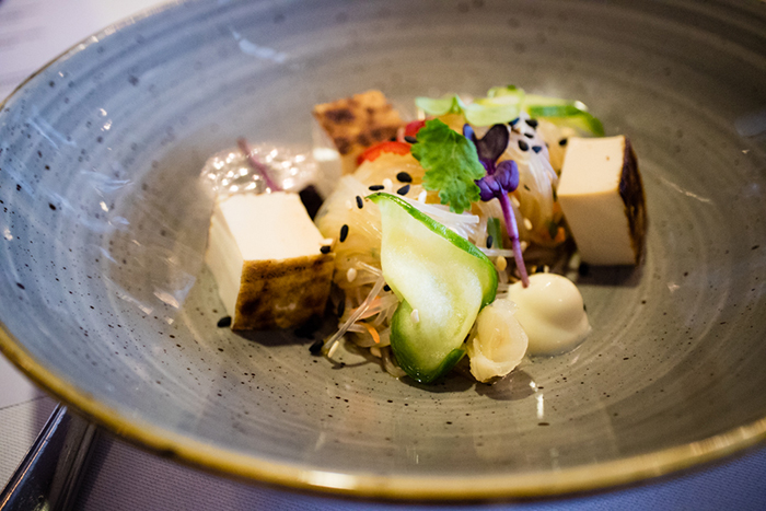 Förrätt: Tofutataki med citron – sesamwasabi, glasnudlar & gurksallad skapad av Joachim Sjöblom.