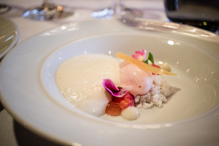 Dessert: Mandelskumm, rabarbersorbet, sockrad rabarber, mandelkaramell & rostad mandel av Hanna Suonpää.
